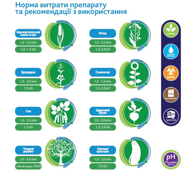 Спеціальне добриво призначене для позакореневого внесення та обробки посівного матеріалу. Всі складові добрива відповідають фізіологічним потребам більшості культур та здатні задовольнити потреби сходів у період, коли коренева система ще не здатна у повній мірі забезпечити повноцінне живлення.
