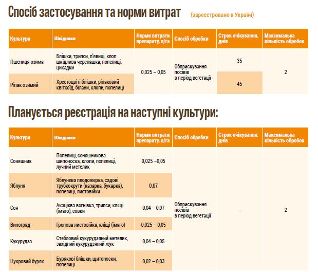 Інсектицид контактно-кишкової дії для контролю широкого спектра шкідників на основних сільськогосподарських культурах. Забезпечує миттєву дію і тривалий захист завдяки сучасній препаративній формі.
