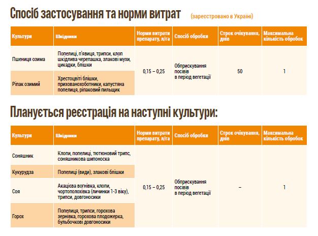 Поєднання двох діючих речовин з принципово різними механізмами дії забезпечує високу ефективність проти популяцій шкідників і запобігає появі стійкості до препарату.