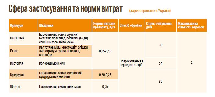 • Комбінація 2-х діючих речовин з різним механізмом дії забезпечує надійний контроль практично всіх шкідників, особливо із ряду лускокрилих.