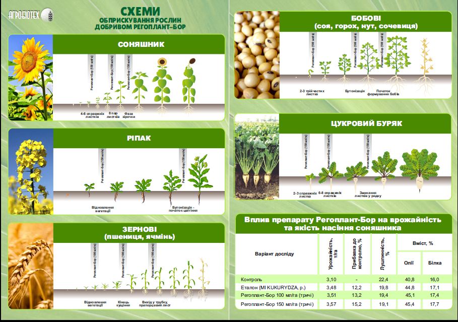Механізм дії: Регоплант-Бор є водно-спиртовим нетоксичним розчином. Комплексне добриво сприяє підвищенню стійкості рослин до несприятливих факторів довкілля – посухи, заморозків, знижує фітотоксичне навантаження від дії пестицидів та перешкоджає впливу їхніх залишкових кількостей в ґрунті. Суттєво підвищує розвиток симбіотичної мікрофлори в зоні кореневої системи. Має антимутагенний ефект, підвищує імунітет рослини, поліпшує якість вирощеної продукції, збільшує врожай. Бор додатково забезпечує білковий та вуглеродний метаболізм, вироблення ДНК та РНК, фітогормонів, формування клітинних стінок, розвиток рослинних тканин, дихальне функціонування. При обробці насіння органо-мінеральне добриво Регоплант-Бор підвищує енергію проростання та схожості насіння.