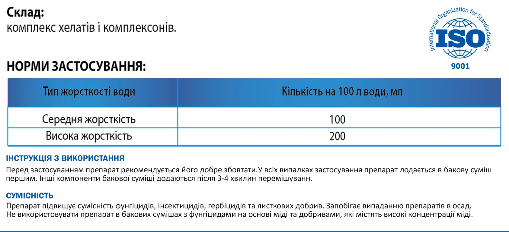 • Покращує сумісність препаратів у бакових сумішах.